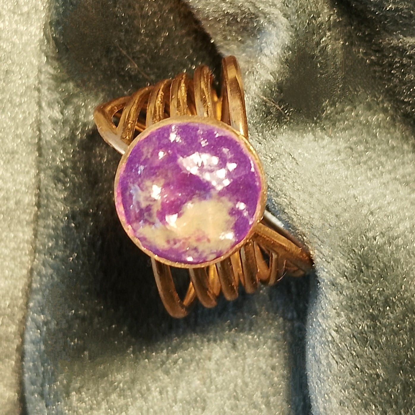 Élégante bague aux nuances violettes nacrées et reflets dorés. Son cabochon aux couleurs délicates évoque la douceur d’un pétale de dahlia. Montée sur anneau doré finement ciselé pour une touche précieuse et féminine. Toutes les couleurs sont possibles.