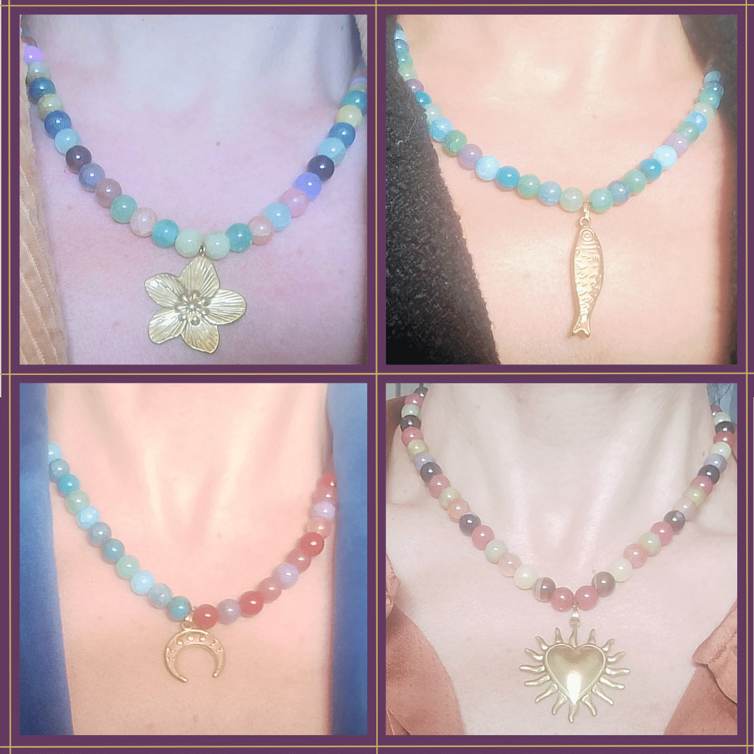 Collier en perles acryliques colorées, entièrement personnalisable. Choisissez les couleurs et le pendentif doré (fleur, lune, soleil, poisson, cœur…) pour créer un bijou unique, à votre image.