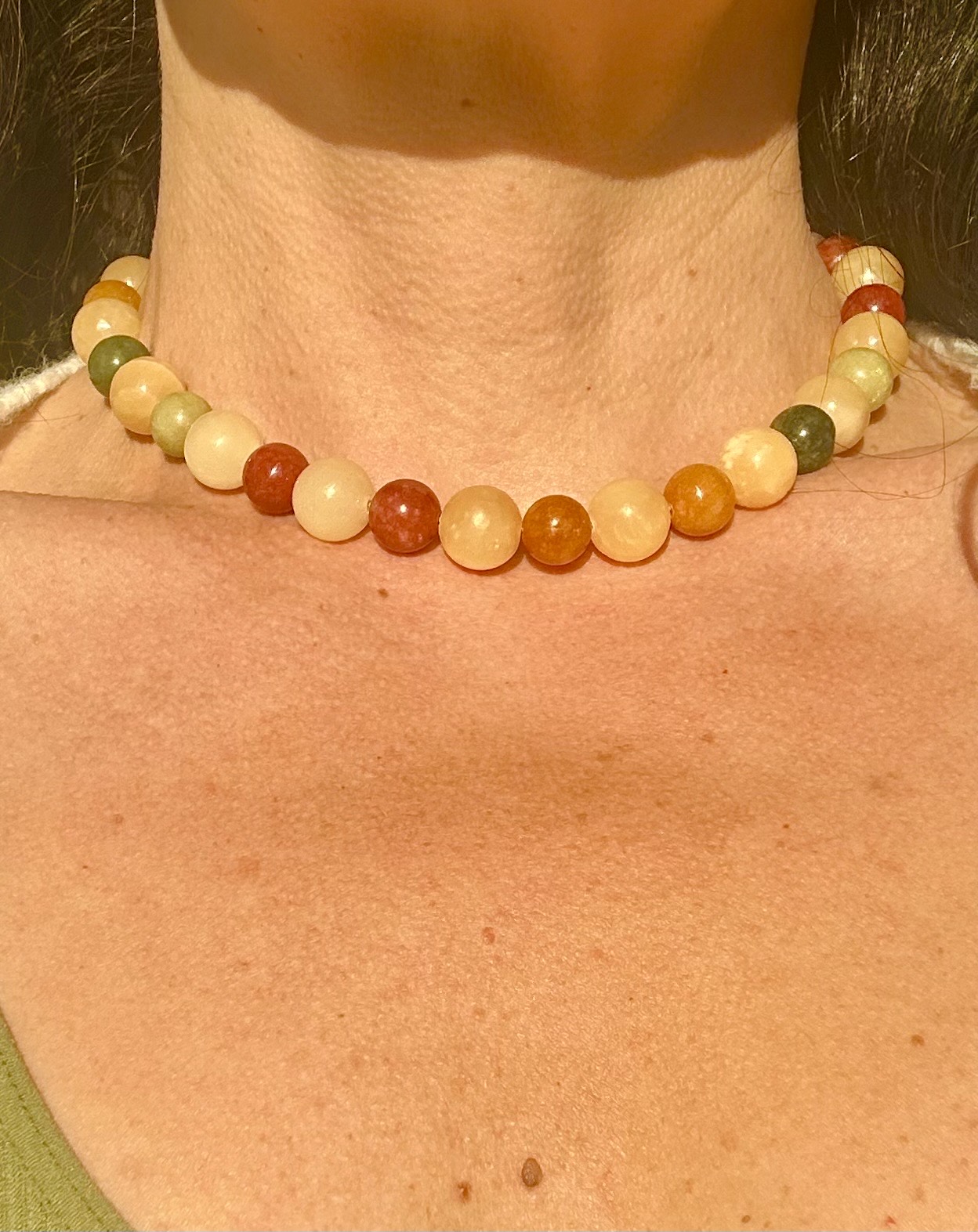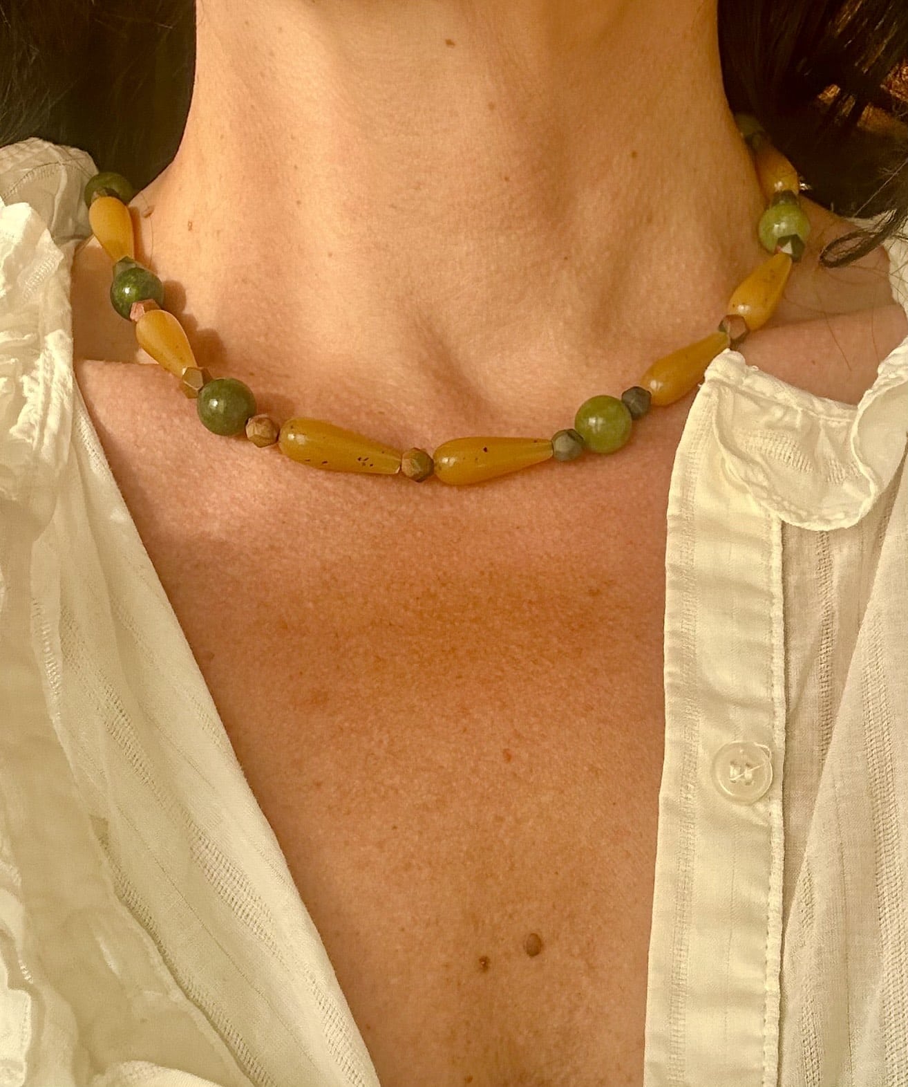 Collier ras du cou composé de perles anciennes chinées en brocante : perles de citrine naturelle aux tons chauds, perles de verre vintage beige crème et vert olive. Fermoir en acier inoxydable pour une finition durable. Un bijou qui sublime les tons naturels de l’automne.
