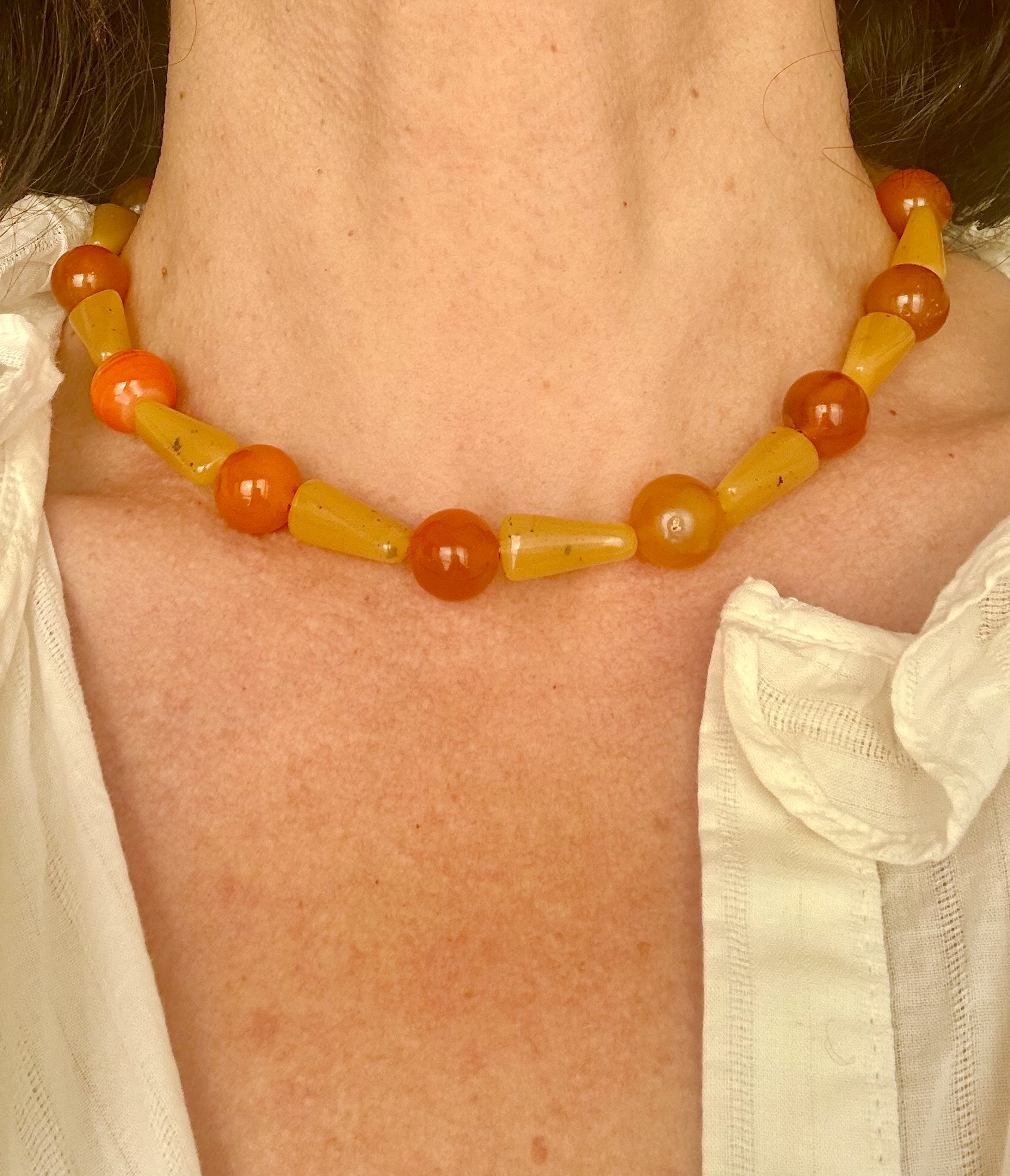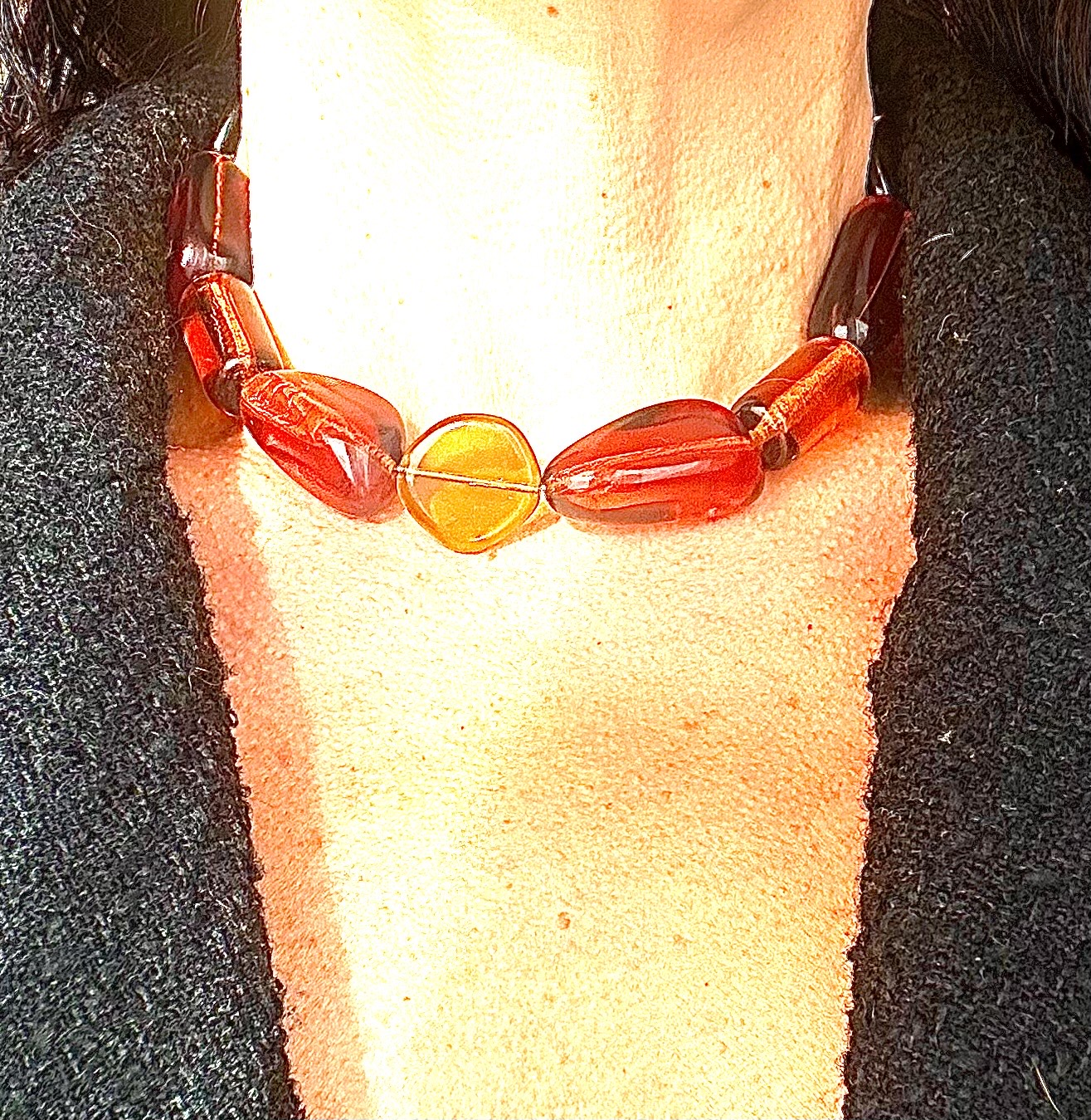 Collier ras du cou composé de perles de verre et acrylique de récupération chinées en brocante. Grandes perles translucides dans les tons orange, ambre et miel, créant de superbes jeux de lumière. Fermoir en acier inoxydable pour une finition durable. Style vintage élégant.