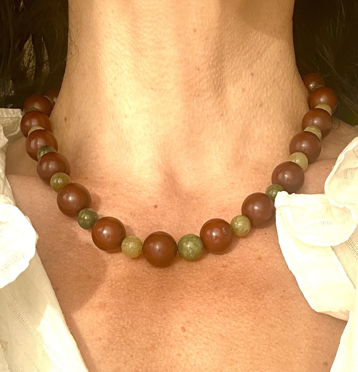 Collier ras du cou composé de perles acryliques et perles de verre de récupération chinées en brocante. Alternance de perles rondes marron chocolat et perles vert olive, créant un camaïeu naturel et chaleureux. Fermoir en acier inoxydable pour une finition durable. Style bohème chic.
