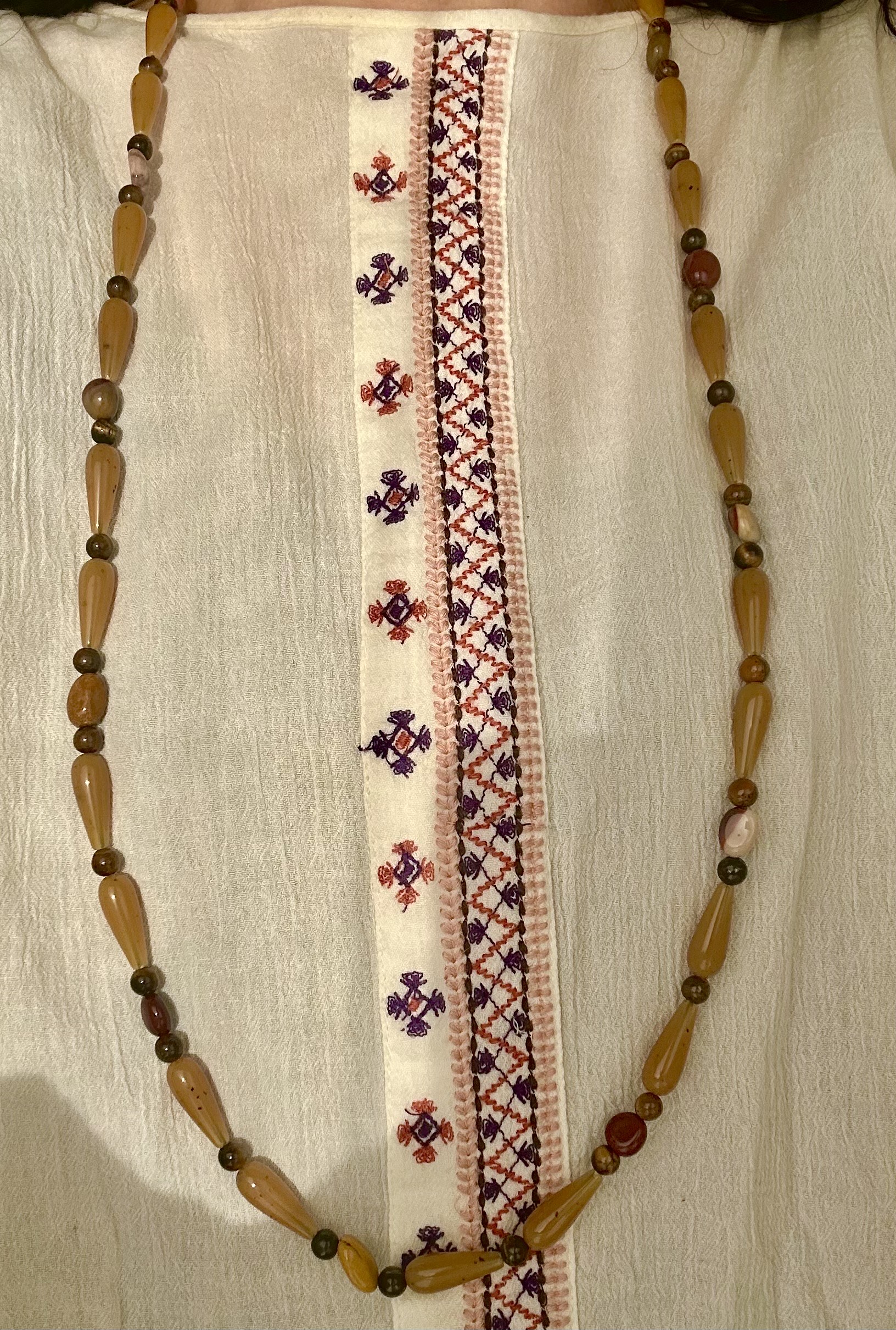 Long collier sautoir composé de perles acryliques, perles de verre et perles d’œil de tigre de récupération chinées en brocante. Alternance de perles tubulaires miel et petites perles rondes d’œil de tigre naturel, créant un bijou bohème aux reflets chaleureux. Fermoir en acier inoxydable pour une finition durable. Se porte long ou doublé pour un style ras du cou.